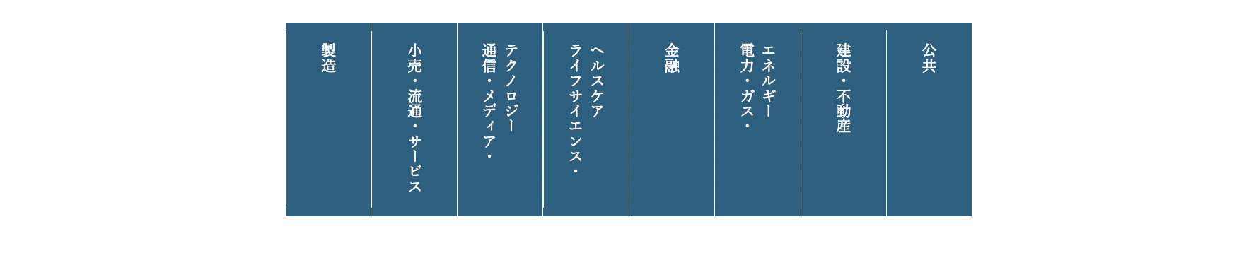 インダストリーサイドのチームは、世の中の様々な業界のクライアント企業にしっかりと刺さりにいくミッションを持って動いているチームですので、日本経済の縮図的に、基本的には全ての業界をカバーする体制を敷いているのが一般的です。